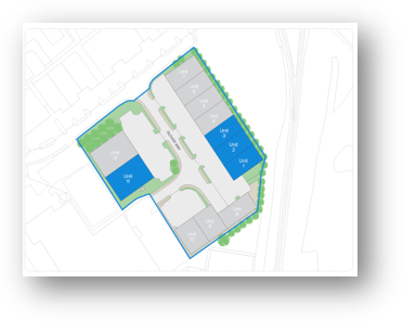 Modern terraced industrial/warehouse units offering roller shutter doors with ground level loading and internal eaves height of 6.61 m. Units from 5,303 sq ft to 9,807 sq ft available now.